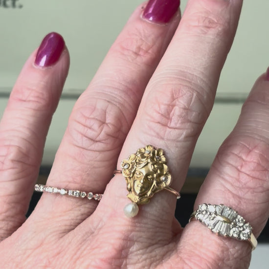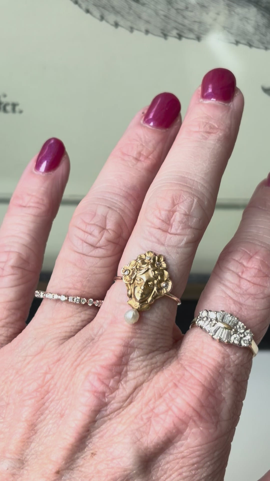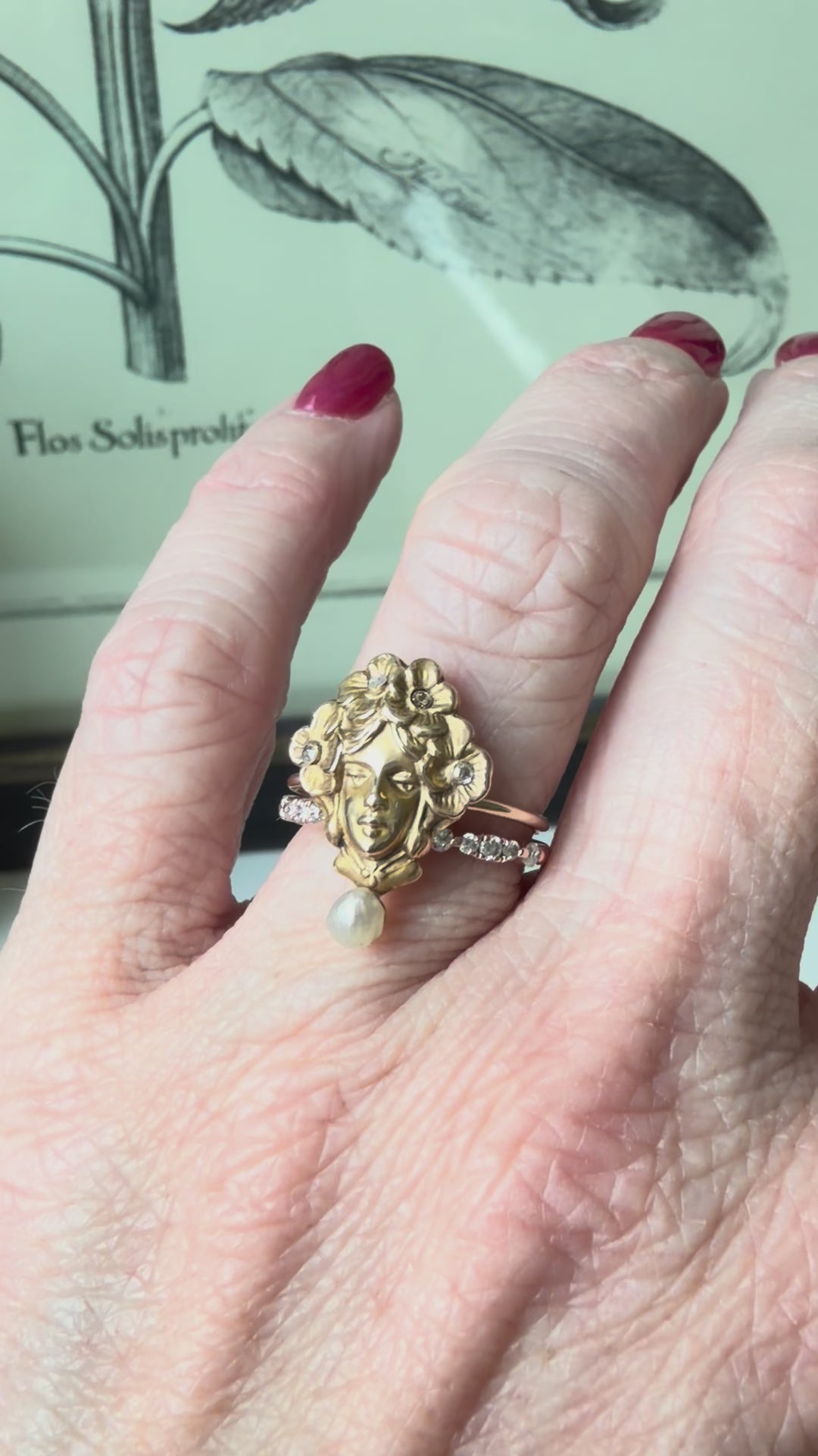 This thoughtfully converted stick pin now lives as a truly special ring, full of that effortless, bohemian charm. At the center is a beautifully detailed woman, her expression serene and timeless, wearing a crown of flowers upon her head. Nestled within each bloom are tiny rose cut diamonds that catch the light in the most subtle, glowy way, while a small baroque pearl rests just beneath her face, adding the sweetest finishing touch.