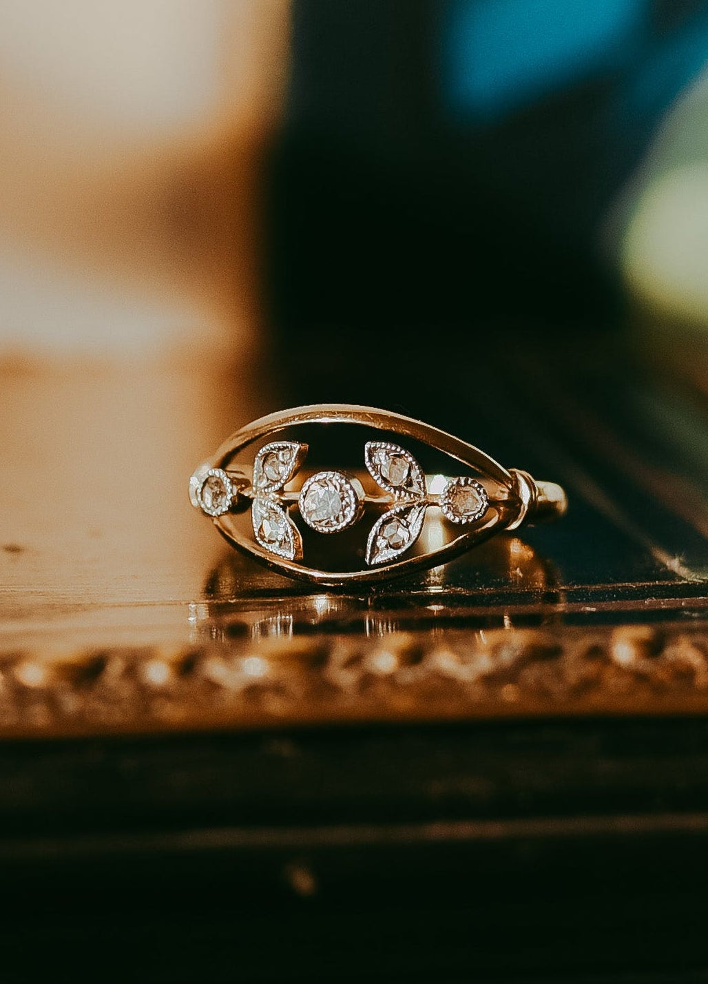 I love how effortlessly feminine it is. The openwork floral design and softly glowing diamonds don’t demand attention, but they for sure reward a closer look. It’s the kind of ring that feels natural on the hand, especially paired with a slim diamond band, where it truly comes to life.