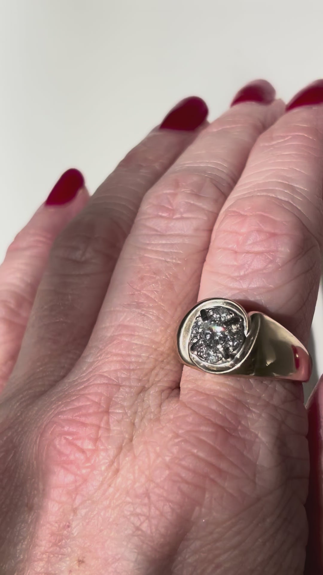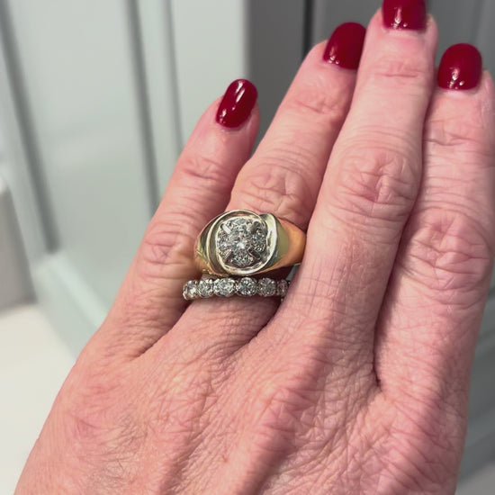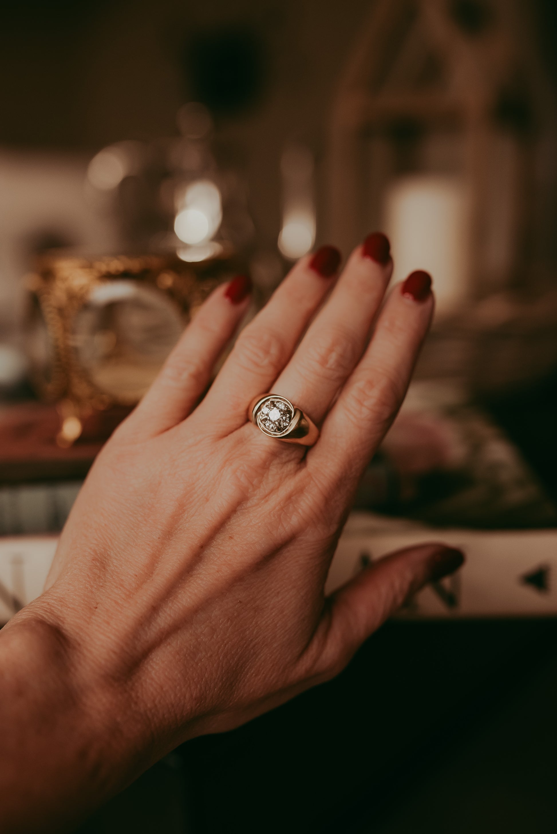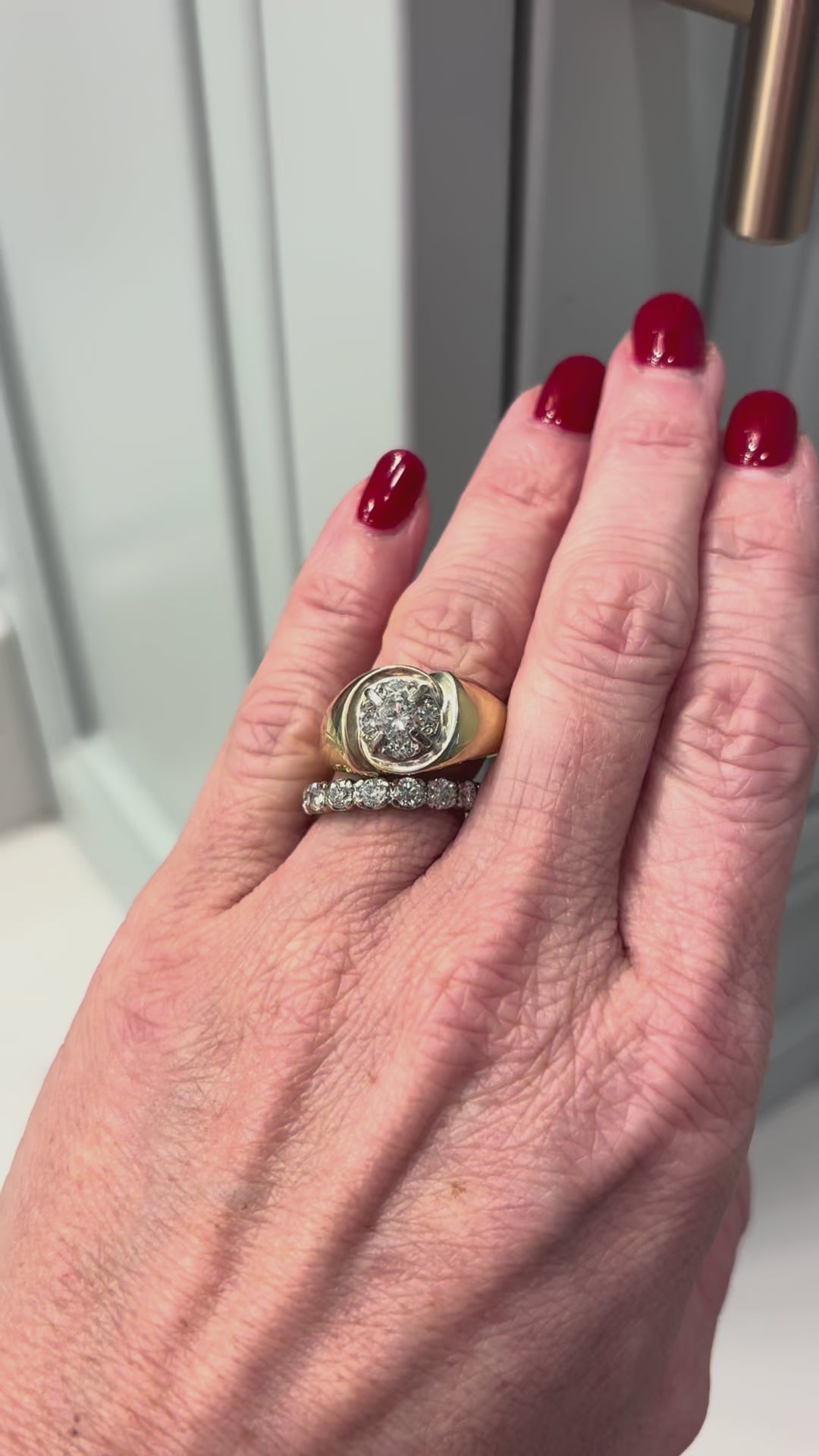 I was immediately drawn to this ring for its presence. Originally made as a gentleman’s ring, it has that confident, sculptural weight that feels effortlessly chic today. The raised floral diamond cluster adds just enough softness to balance the bold gold form, making it a piece that feels timeless rather than trend-driven.