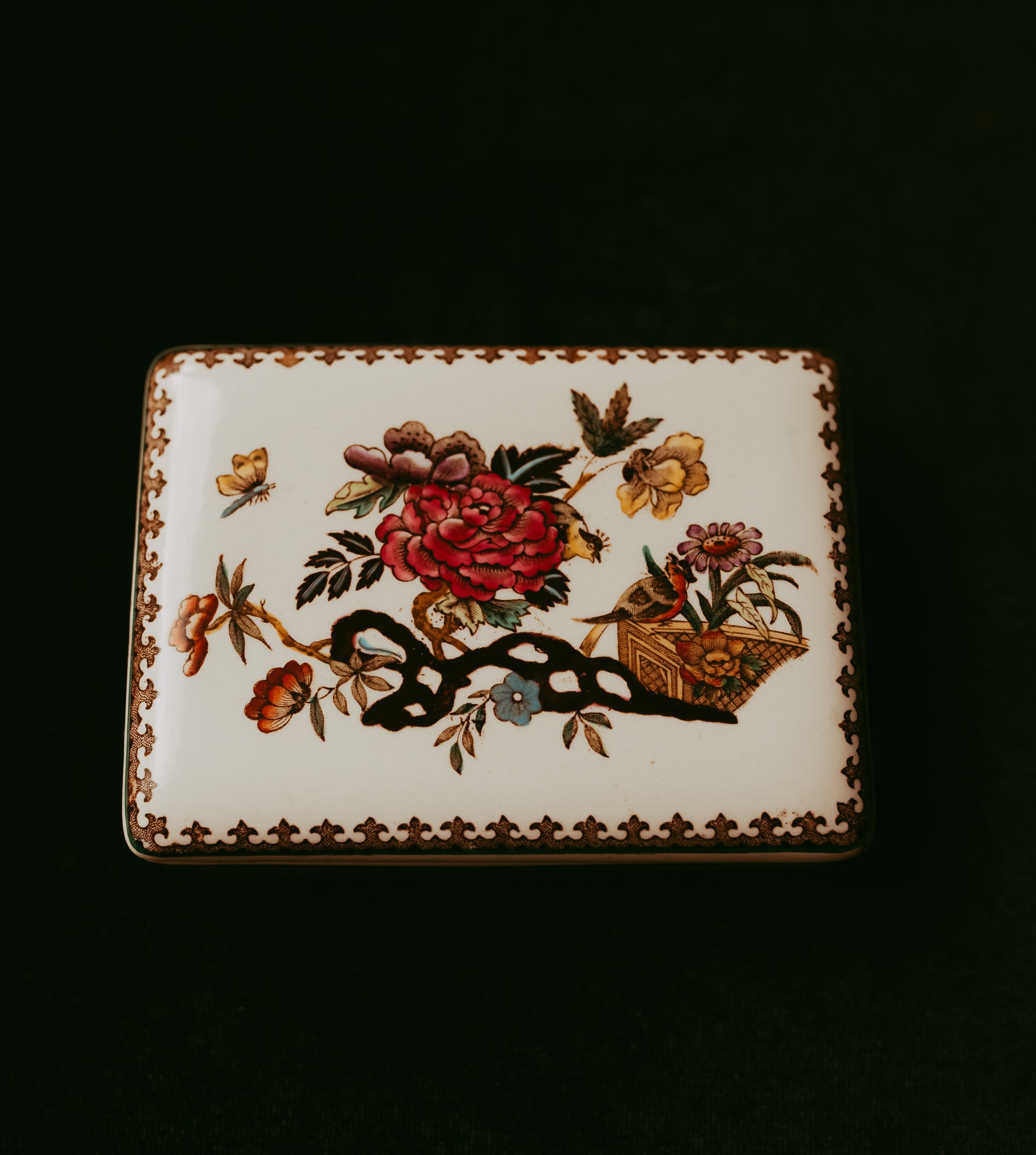 This charming vintage trinket box by Wedgwood is a perfect blend of vibrant detail and timeless design. Made between the 1950s and 1970s, the box features rich brown tones accented with colorful birds, butterflies, and florals, all framed by an elegant fleur-de-lis border.