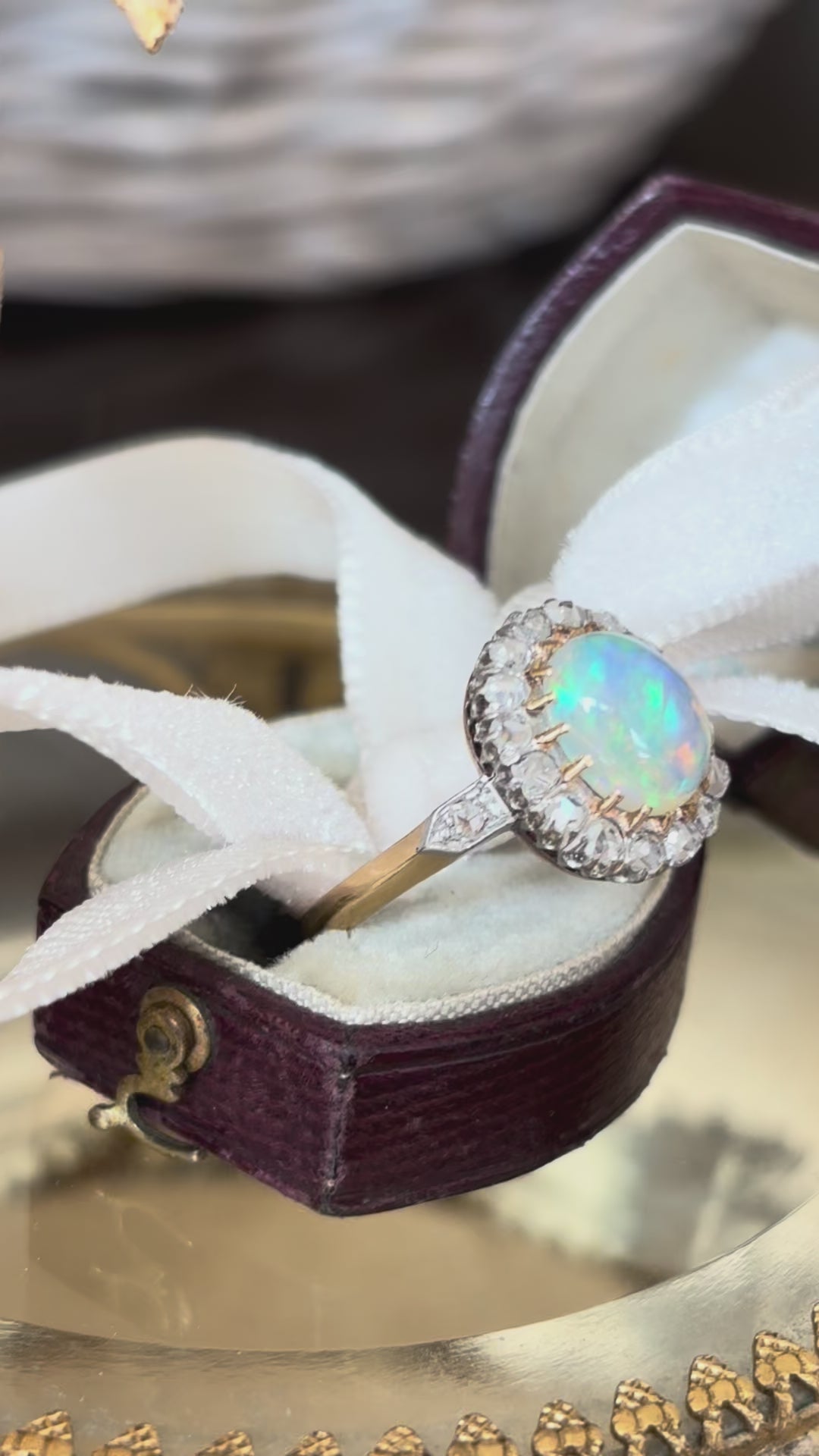 CONDITION: Excellent antique condition. The opal and diamonds are secure with no movement. Light surface scratches to the gold, consistent with age and wear.