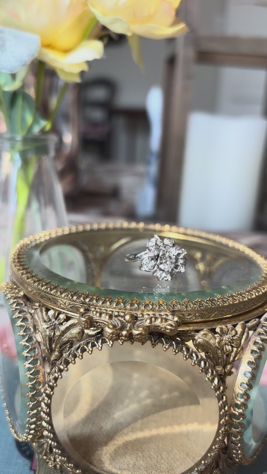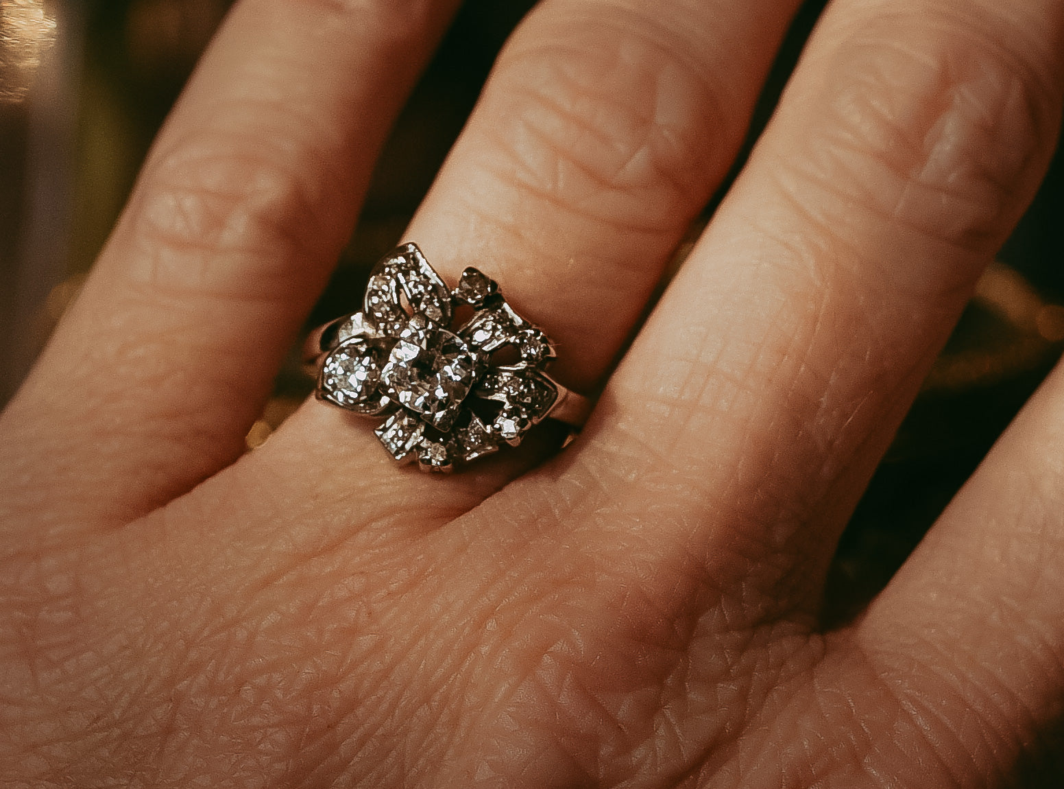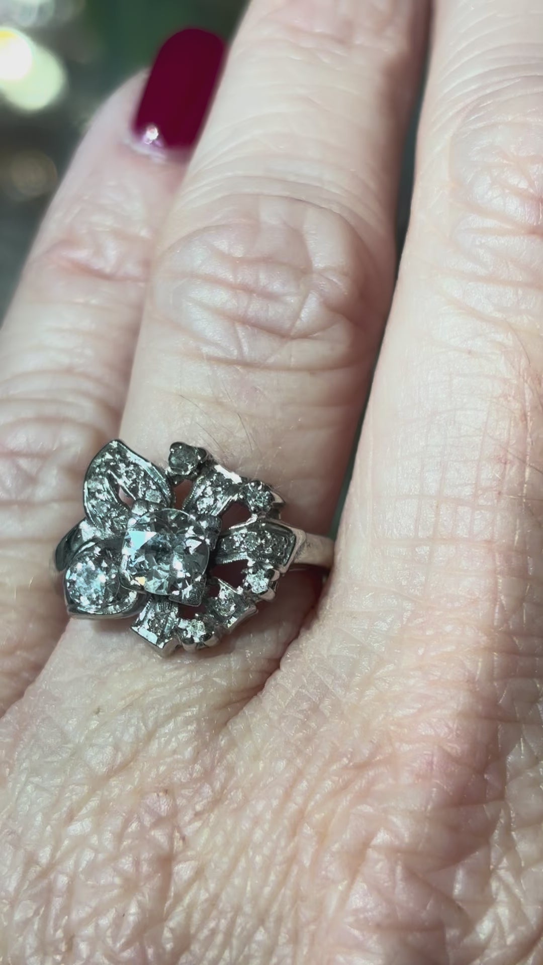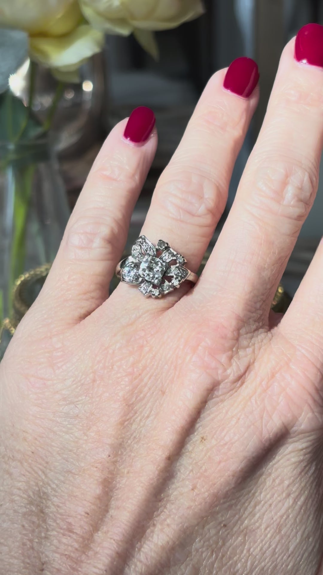 A ring that feels as fresh today as it did over seventy years ago, it’s perfect for anyone who appreciates mid-century craftsmanship, floral-inspired jewelry, and heirloom-quality diamonds.