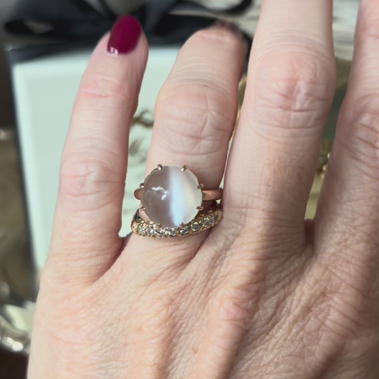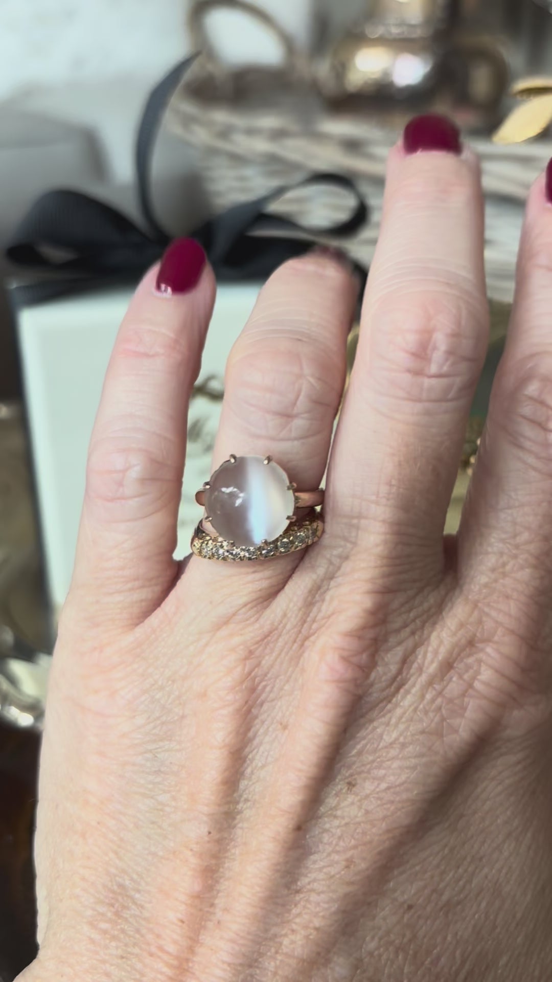 Moonstones are loved for their ethereal glow, known as adularescence, a shifting play of light that glides across the surface like mist over water. This stone has beautiful, distinct lines of light that move as the ring is turned, making it especially captivating.