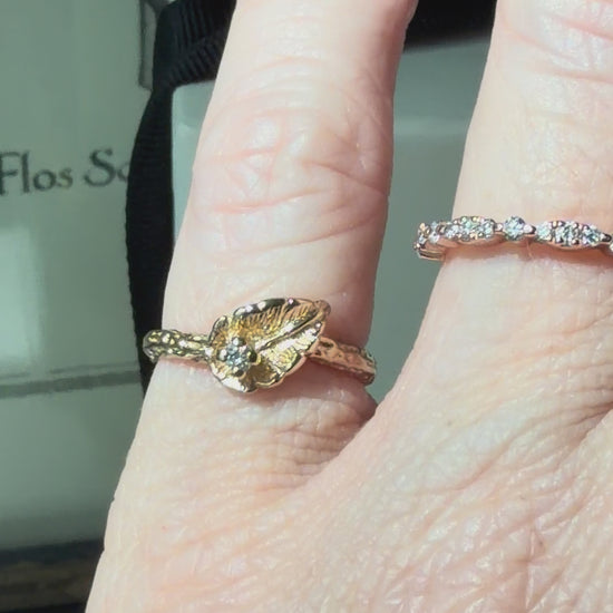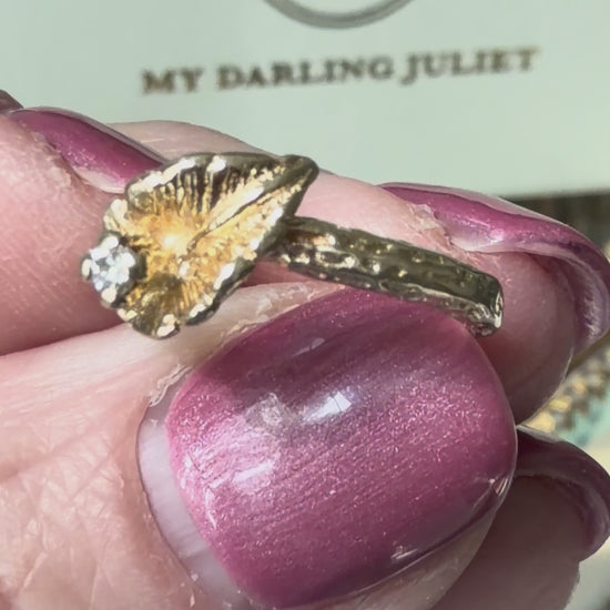 Delicate and quietly romantic, this vintage ring captures the beauty of nature in a softly sculptural form. At its center, a gently curved golden leaf cradles a small diamond, its silhouette evoking the elegance of a calla lily in bloom. The shoulders continue the story, etched with fine botanical detailing that gives the piece a graceful, organic flow from every angle.