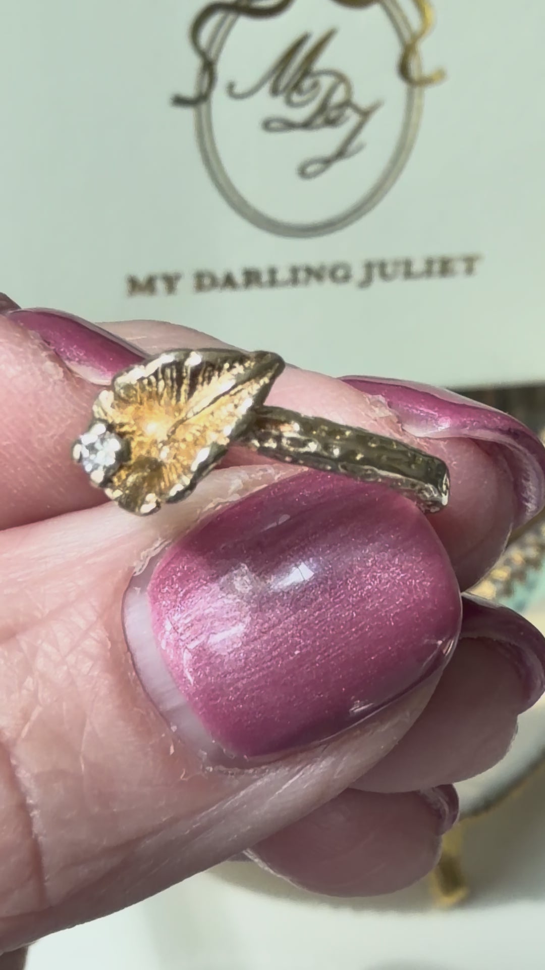 ALL PROPS or OTHER JEWELRY, NOT INCLUDED: THIS LISTING IS FOR THE VINTAGE DIAMOND LEAF | CALLA LILY RING IN 10K GOLD.