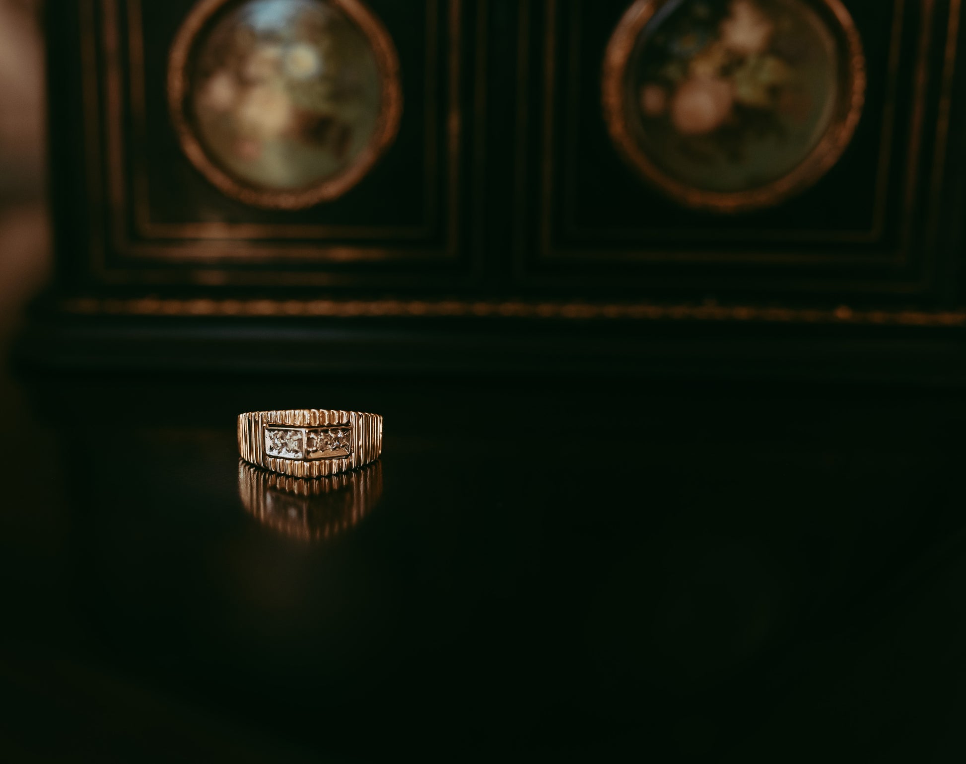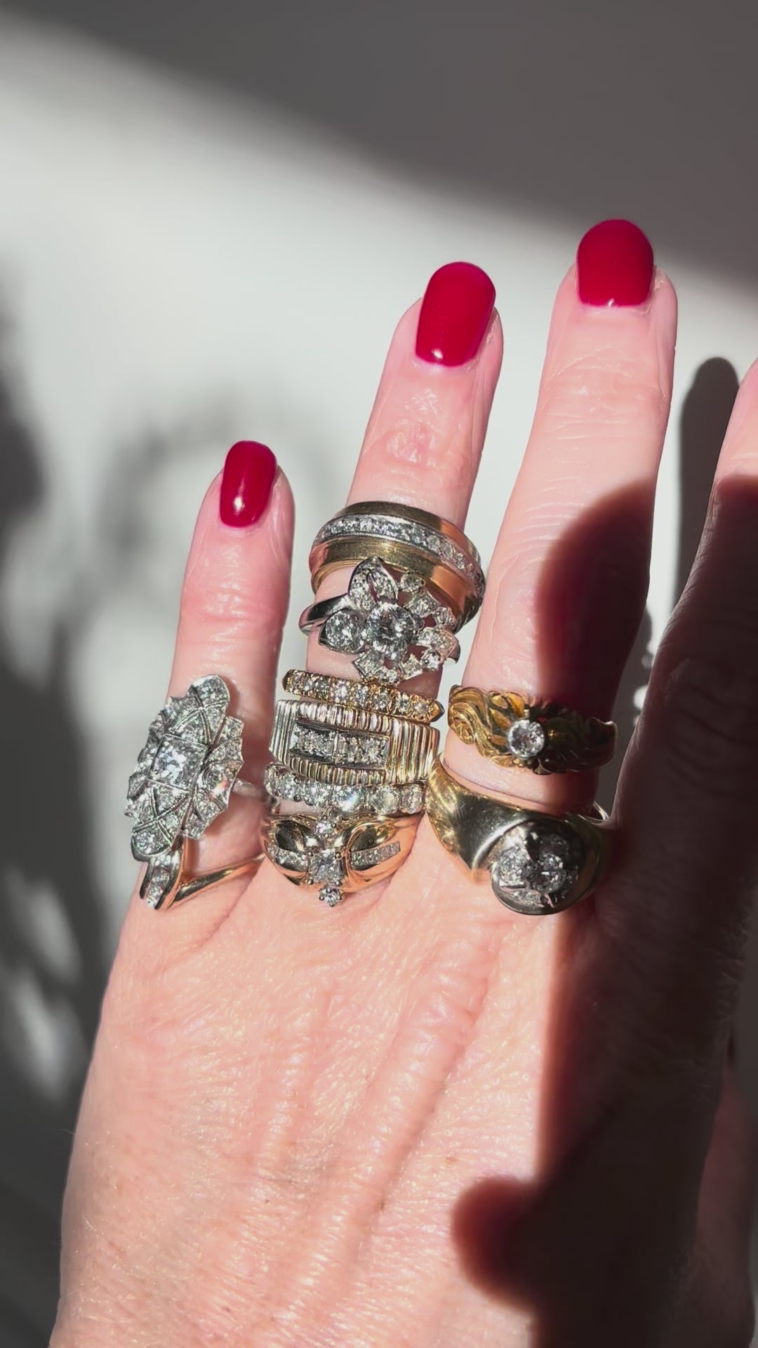 Designed with a bold yet wearable profile, this ring transitions beautifully between the pointer, middle, and ring finger. It layers effortlessly with a diamond band, creating a modern stacked look while still honoring its vintage character.